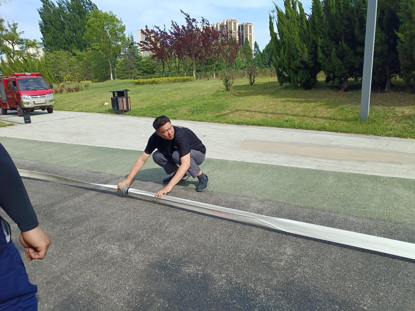 在水帶對接滅火環節,由1名女隊員負責答題,另外兩名隊員負責在50米的賽道上對接消防水帶。賽場上,隊員們爭分奪秒、團結協作,將消防救援技能水平展現得淋漓盡致。